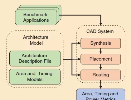 如圖2所示,F(xiàn)PGA架構(gòu)評估流程由三個主要組件組成:一套基準應(yīng)用、一個架構(gòu)模型和一個CAD系統(tǒng)。與為特定功能構(gòu)建的ASIC不同,F(xiàn)PGA是為許多用例設(shè)計的通用平臺,其中一些用例甚至可能在FPGA構(gòu)建時不存在。因此,在實現(xiàn)代表關(guān)鍵FPGA市場和應(yīng)用領(lǐng)域的各種基準設(shè)計時,將根據(jù)效率來評估FPGA架構(gòu)。通常,每個FPGA供應(yīng)商都有一套精心選擇的基準設(shè)計,這些設(shè)計是從專有系統(tǒng)實現(xiàn)和各種客戶應(yīng)用中收集的。還有幾個開源基準套件,如經(jīng)典的MCNC20[13]、VTR[14]和Titan23[15]套件,這些在學(xué)術(shù)FPGA架構(gòu)和CAD研究中是常用的。雖然早期的學(xué)術(shù)FPGA研究使用了MCNC設(shè)計套件,但這些電路現(xiàn)在太小(數(shù)千個邏輯原語)和太簡單(只有輸入輸出和邏輯),無法代表現(xiàn)代FPGA用例。VTR,尤其是Titan套件更大、更復(fù)雜,使它們更具代表性,但隨著FPGA容量和應(yīng)用復(fù)雜性的不斷增長,通常需要新的基準套件。圖2:FPGA架構(gòu)評估流程評估流程的第二部分是FPGA架構(gòu)模型。FPGA的設(shè)計涉及來自架構(gòu)級組織的許多不同決策(例如塊的數(shù)量和類型、線段長度的分布、邏輯簇和邏輯元件的大小)到晶體管級電路實現(xiàn)(例如可編程開關(guān)類型、布線緩沖器晶體管大小、寄存器實現(xiàn))。還涉及到不同的實現(xiàn)風(fēng)格;邏輯塊和可編程布線被設(shè)計和布局為全定制的電路,而大多數(shù)硬化的塊(例如DSP)分別為模塊內(nèi)核和外設(shè)混合了標準單元和全定制設(shè)計。一些模塊(存儲、輸入輸出)甚至包括重要的模擬電路。所有這些不同的組件都需要仔細建模,以評估整個FPGA架構(gòu)。除了從每個組件的電路級實現(xiàn)中獲得的面積、時序和功率模型之外,這通常使用架構(gòu)描述文件來獲取,架構(gòu)描述文件指定不同的FPGA塊和布線架構(gòu)的組織和類型。最后,使用可重定位的CAD系統(tǒng),如VTR [14],將選定的基準應(yīng)用映射到指定的FPGA架構(gòu)上。這種CAD系統(tǒng)由一系列復(fù)雜的優(yōu)化算法組成,這些算法將寫在HDL中的基準綜合為電路網(wǎng)表,將其映射到不同的FPGA塊,將映射的塊放置在FPGA上的特定位置,并使用指定的可編程布線架構(gòu)在它們之間布線連接。然后,我們用由CAD系統(tǒng)產(chǎn)生的實現(xiàn)來評估幾個關(guān)鍵指標。總面積是應(yīng)用使用的FPGA塊的總面積,以及其中包含的可編程布線。時序分析器找到通過塊和布線的關(guān)鍵路徑,以確定應(yīng)用時鐘的最大頻率。功耗是根據(jù)使用的資源和信號切換速率來估計的。FPGAs從來不是為一個應(yīng)用設(shè)計的,所以這些指標在所有基準中是平均的。最后,根據(jù)架構(gòu)目標(例如高性能或低功率)。其他指標,如CAD工具運行時間以及CAD工具未能在一個架構(gòu)上布線一些基準也經(jīng)常被考慮。
