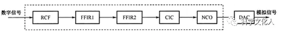 對(duì)于發(fā)射端來(lái)講,基帶信號(hào)需要經(jīng)過(guò)多速率發(fā)送處理器處理后,再進(jìn)行數(shù)/模轉(zhuǎn)換(DAC)。多速率發(fā)送處理器的一般結(jié)構(gòu),主要由四部分組裝成:可編程插值FIR濾波器(RCF)、兩個(gè)固定系數(shù)的FIR濾波器(FFIR)、高速的CIC插值濾波器以及數(shù)控頻率振蕩器(NCO)。