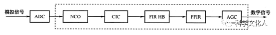 在無(wú)線通信中,多速率接收處理器在ADC之后工作,主要包含五部分:數(shù)控頻率振蕩器(NCO)、高速的CIC抽取濾波器、可編程抽取FIR半帶濾波器(FIR HB)、兩個(gè)固定系數(shù)的FIR濾波器(FFIR)、以及自動(dòng)增益控制模塊(AGC),其結(jié)構(gòu)如圖所示。